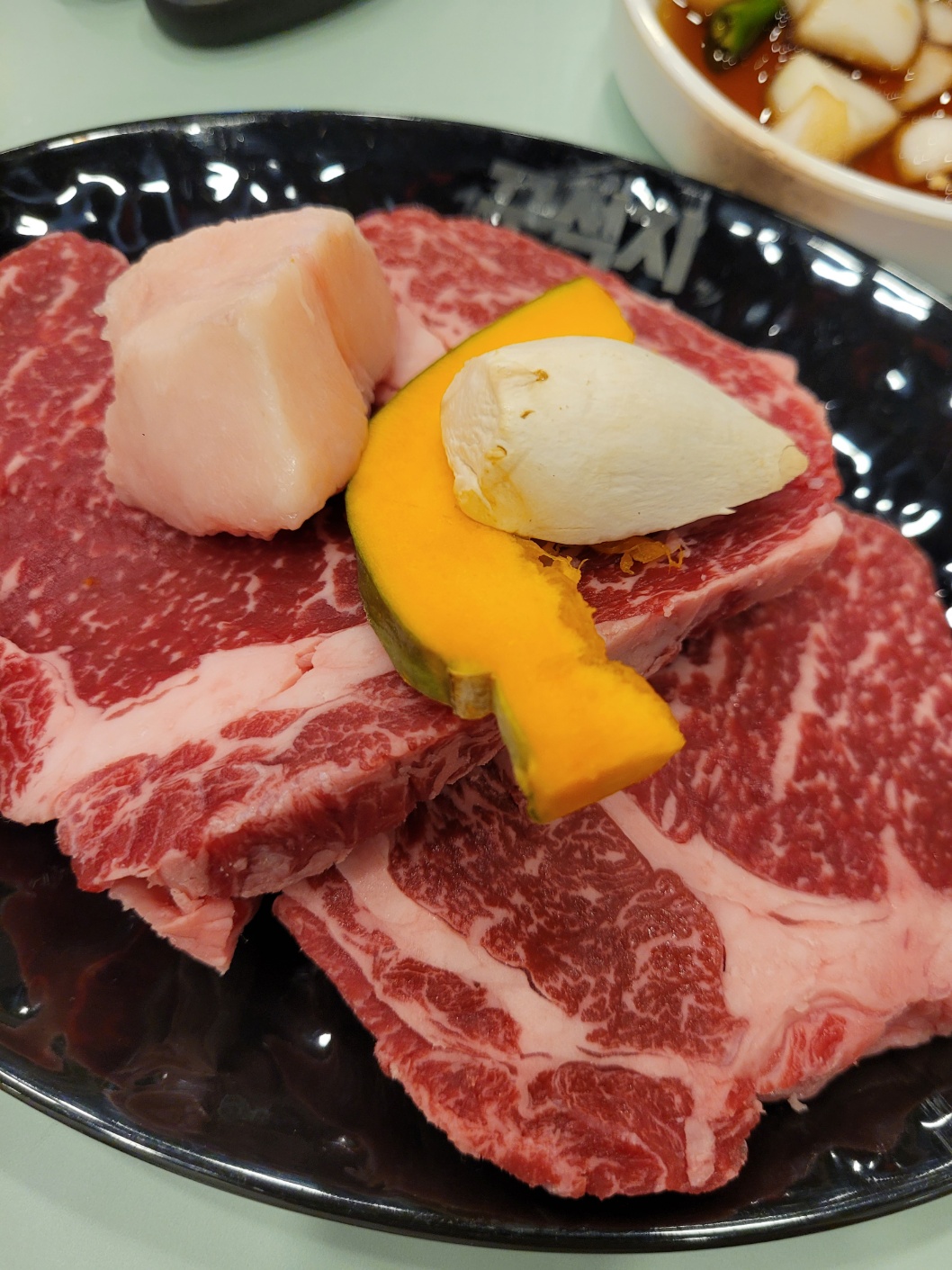 등심은 100g 에 9800원 정도 했으며 다른 부위는 비싸도 100g에 12,000~13,000원 정도의 가격대로 구성되어 있었던 것으로 기억합니다. 우리는 등심 3인분과 마늘소갈비, 토시살 추가해서 먹었고 주류와 합쳐서 10만원 가량 (3인 기준) 나왔습니다.