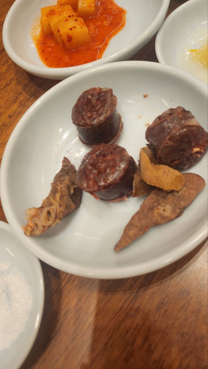 일단 들어가보면 돼지 부속부위가 무한리필이라기보다는 대실역점은 순대가 있었습니다. 순대 셀프코너가 있어서 몇개 가지고 왔는데 생각보다 퀄리티가 있었습니다. 술을 좋아하시는 분들은 국밥 한그릇에 순대까지 먹으면 좋은 안주가 될 것 같다고 생각했습니다. 일행은 시그니쳐인 애호박얼큰국박을 먹었고 저는 순대 퀄리티를 생각하지 못하고 수육이 추가된 국밥정식을 시켰습니다. 순대가 이정도였다면 정식이 아닌 국밥만 시켜도 될 것 같다고 생각됩니다.